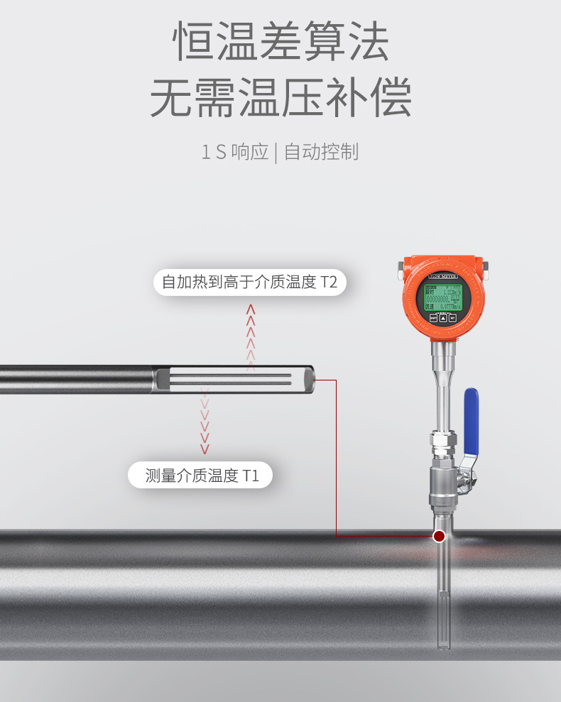热式气体质量流量计是基于热扩散原理而设计的,该仪表采用恒温 差法对气体进行准确测量。具有体积小、数字化程度高、安装方 便,测量准确等优点。