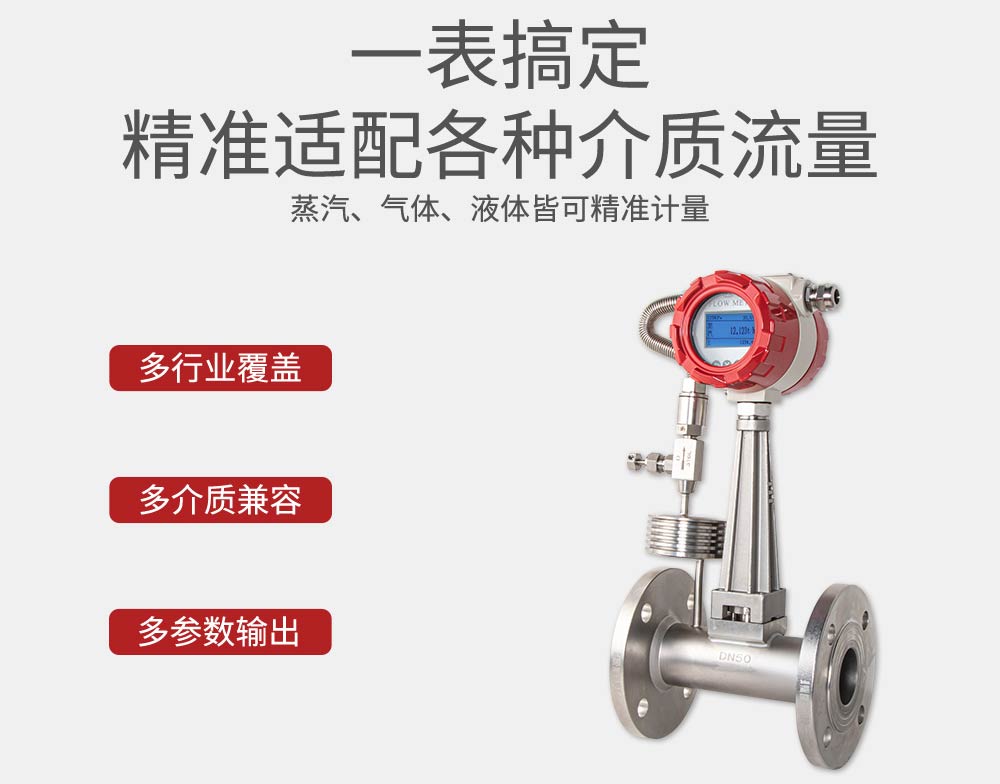 涡街流量计是速度式流量计的一种,基于卡门(Karman)旋涡原理研究设计的,主要用于工业管道中介质流体的流量测量,如:气体、蒸汽或液体等多种介质的流量控制和计量。涡街流量计广泛应用于供热、供气、化工、环保、冶金、纺织、钢铁、医药、造纸、排水等厂矿企业对过热蒸汽、饱和蒸汽、压缩空气和一般气体(氧气、氮气、氢气、天然气、煤气等)、水和液体(如:水、汽油、酒精、苯类等)的计量和控制。