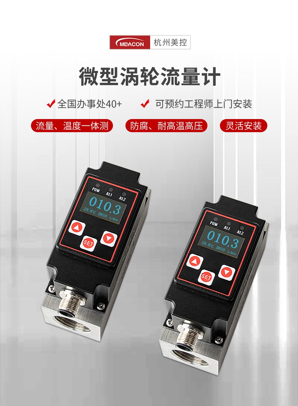 微型涡轮流量计结构简单、精确度高、安装维修使用方便,可对管道中的液体流量及温度情况进行实时监控,支持流量和温度(4~20)mA 信号或 485 通信、报警开关输出,并采用 OLED 实时显示流体流量及温度,实现管道当中流量温度一体式的监控功能。本产品广泛应用于石油化工、电力、治金、钢厂、造纸、食品加工、水处理、电池厂等行业。