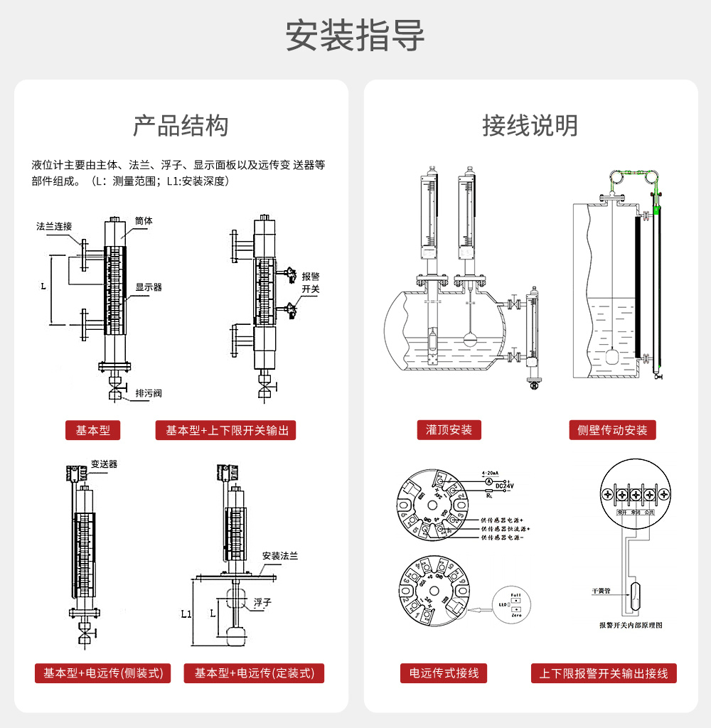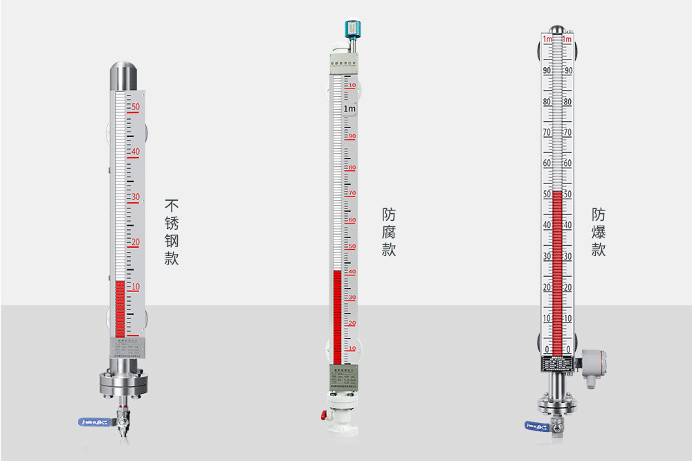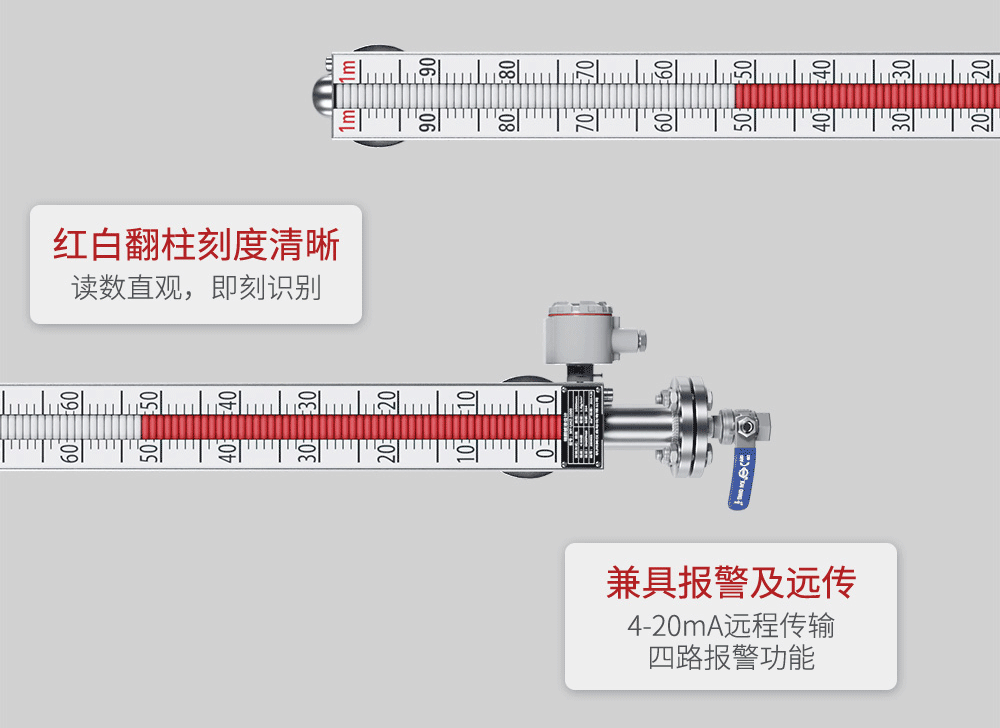 在液位计的主体上安装变送器,可以实现远传显示,变送器由传感器和转换器两部分组成,传感器通过磁浮子上下移动,经磁耦合作用使导管内干簧管(或磁传感器)依次动作,获得电阻信号变化,转换成(4~20)mA 的标准电流信号输出。在液位计主体上安装报警开关,可实现报警或联锁控制。适用于低温到高温、真空到高压等各种环境,是石油化工等行业理想的液位测量产品。