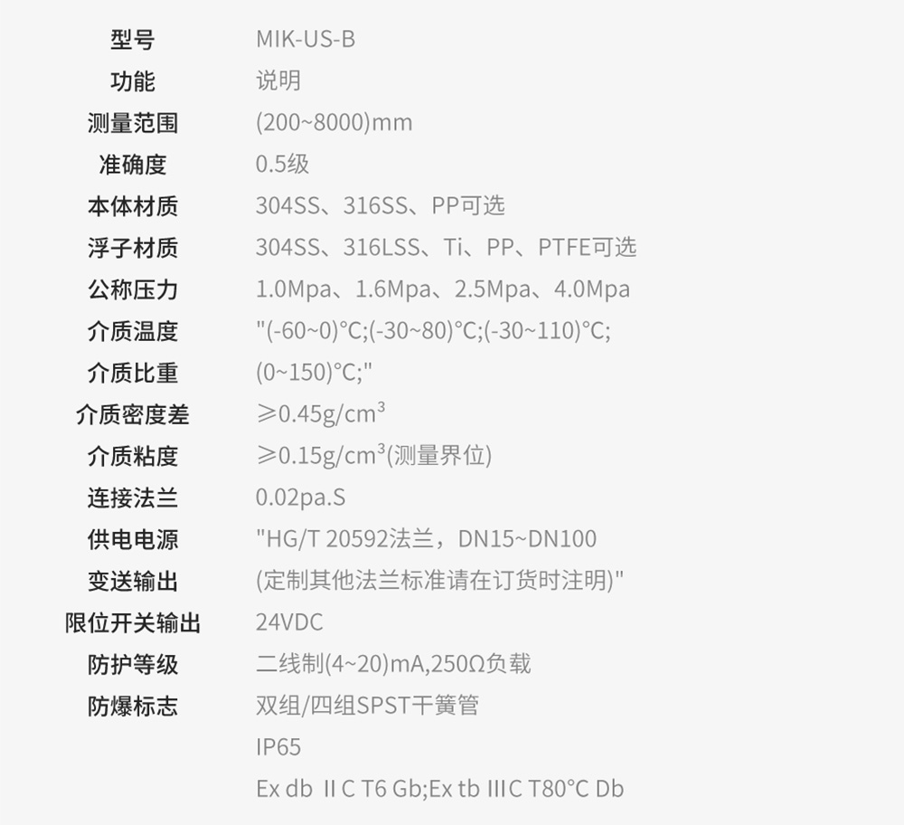 MIK-UZ-B磁翻板液位计根据浮力原理,浮子在测量筒内随液位的升降而上下移动,浮子内的永久磁钢通过磁耦合作用,驱动红白翻柱翻转 180°,液位上升时,翻柱由白色转为红色,下降时由红色转为白色,从而实现液位的指示。